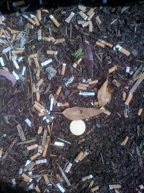 Da auf dem Gelände des Krankenhaus Rauchverbot herrscht, sieht es um die drei Bänke an der Straße davor so aus – ob ein Aschenbecher die situation verbessern würde, weiß ich nicht. Nur hier zu sitzen, ist wie Passivrauchen. 🙁