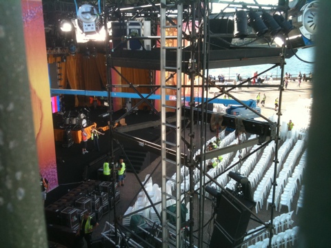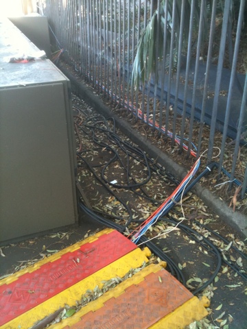 When I went home, I took a wrong turn and passed by a very interesting sight. Behind the trucks for cutting the video feeds of the show, there were a lot of energy cables laying around. Also, there were a bunch of very familiar looking cables: indoor network cables – probably Cat. 5. Looking closer, I found another type of cables: fiber channel. Not that they bothered to use the outdoor type, they used the very thin indoor ones. For those of you not familiar with the problem there, fiber channel cables are very sensitive and fragile and they are easy to break. If you have a look at them on the picture below, you can imagine the rushing heartbeats of a professional Network guy like me. Not to mention that anyone could just come by and cut them.